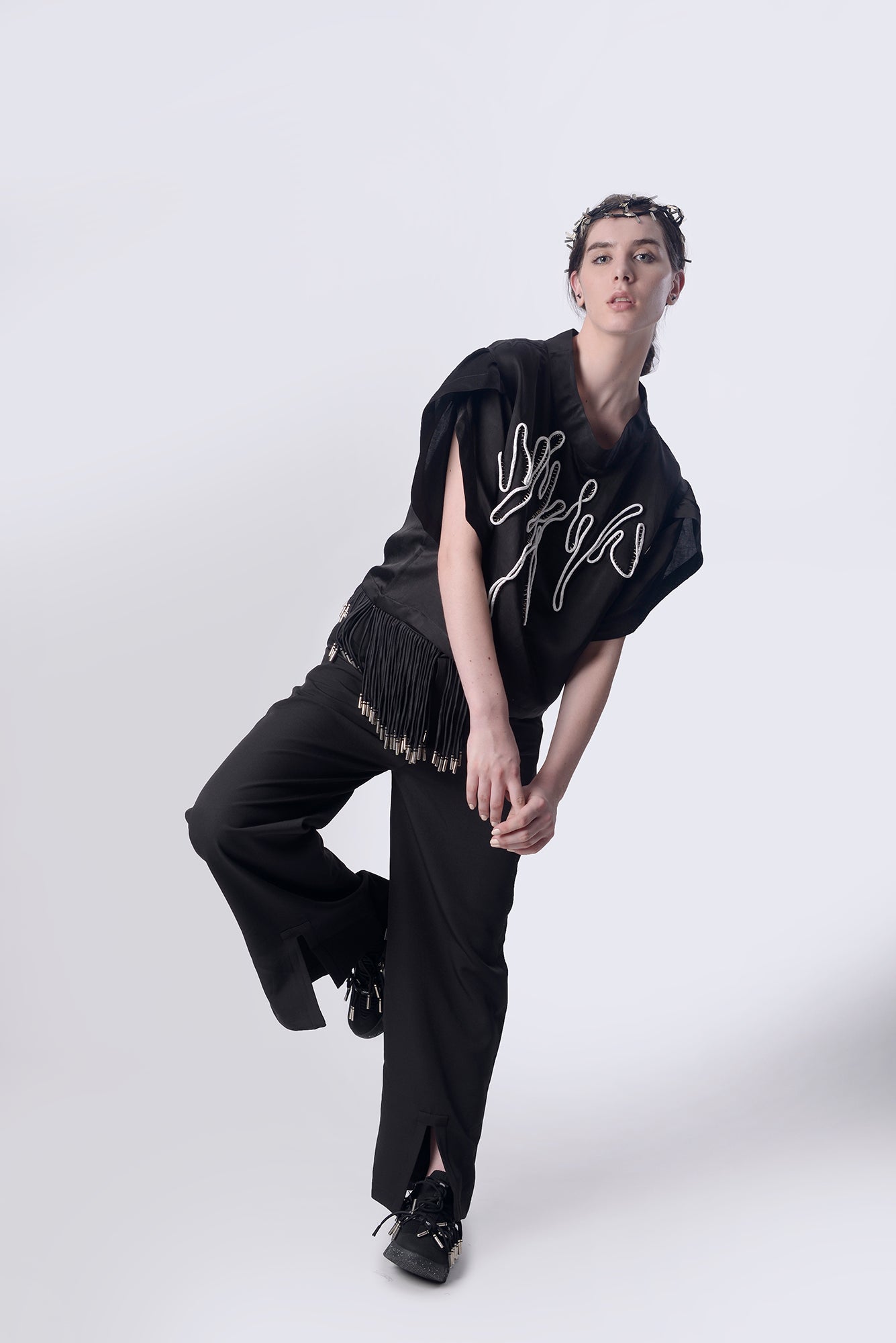 3D hand embroidered wide neck top with petal sleeves paired with relax fit cullote pants.
