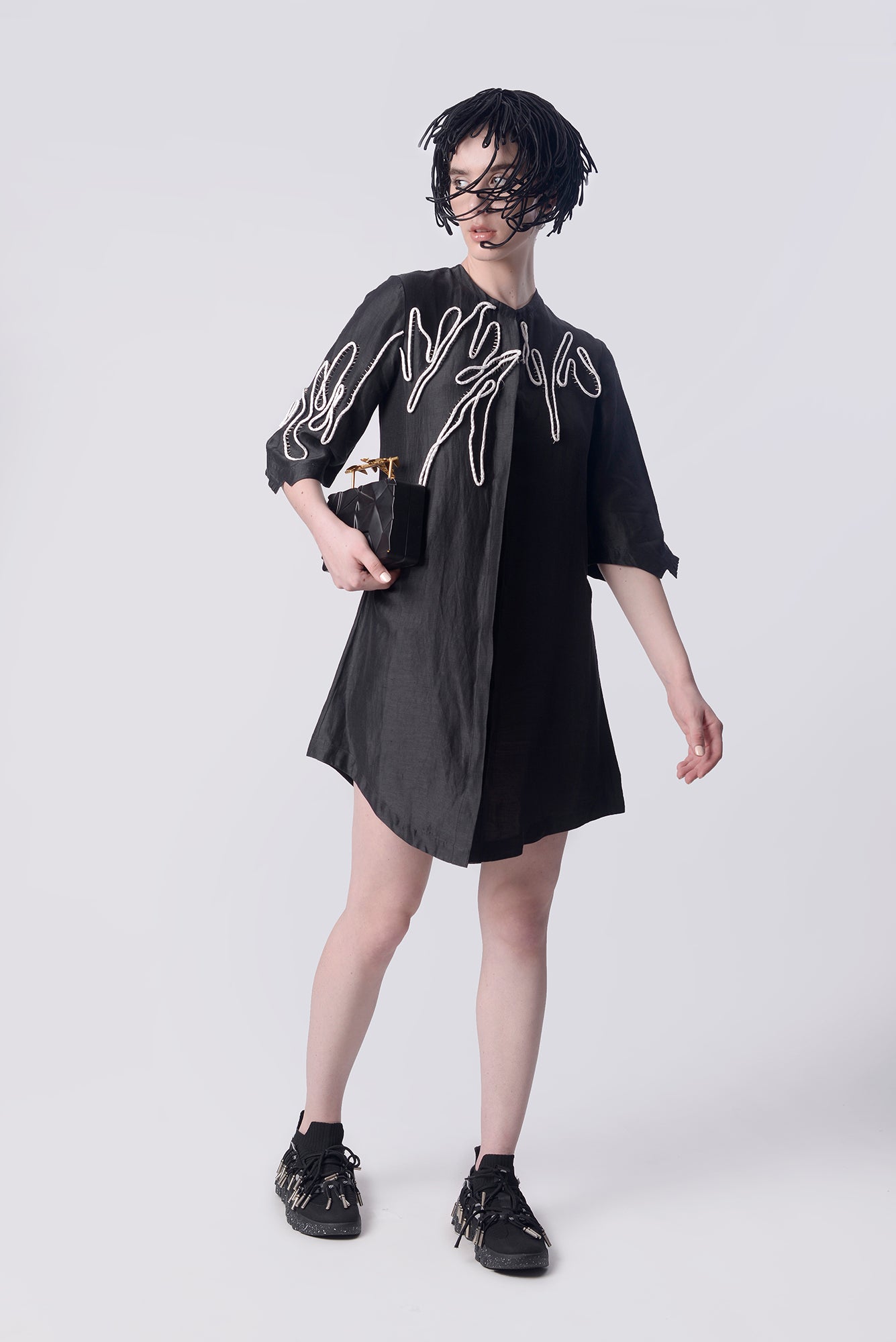 3D hand embroidered knee length dress in linen satin. The dress has a button down opening at the centre front.