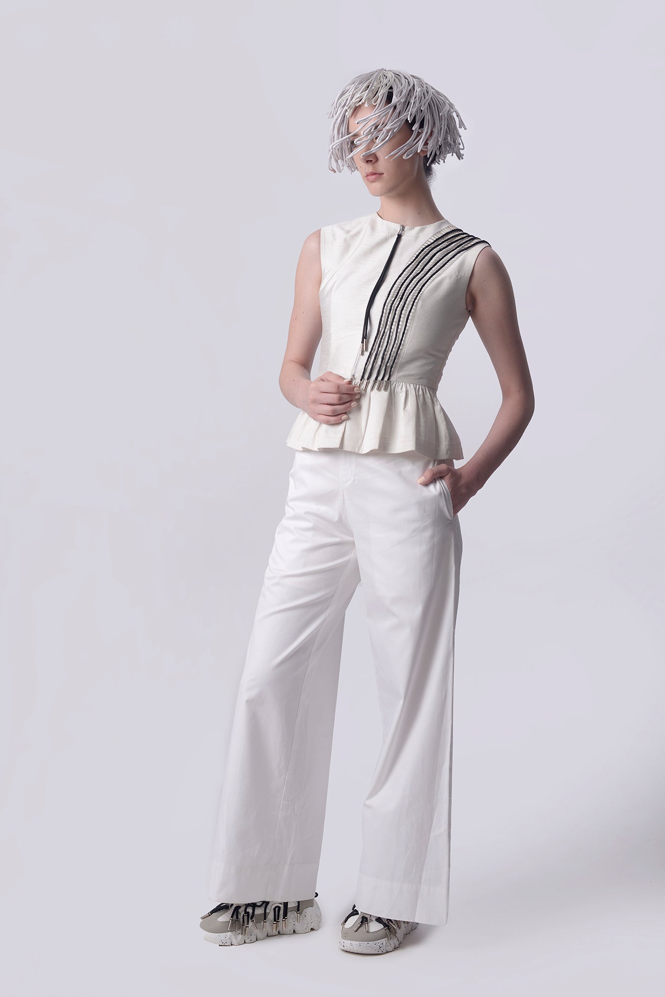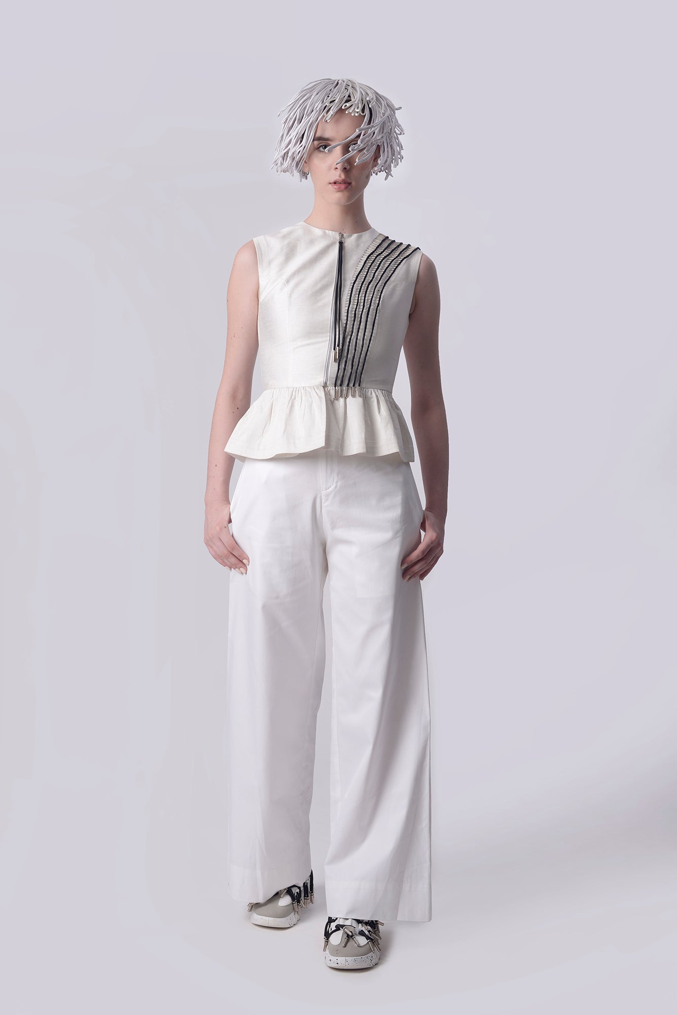 3D hand embroidered white peplum top in silk dupion. The top has a metal zip opening in the front.