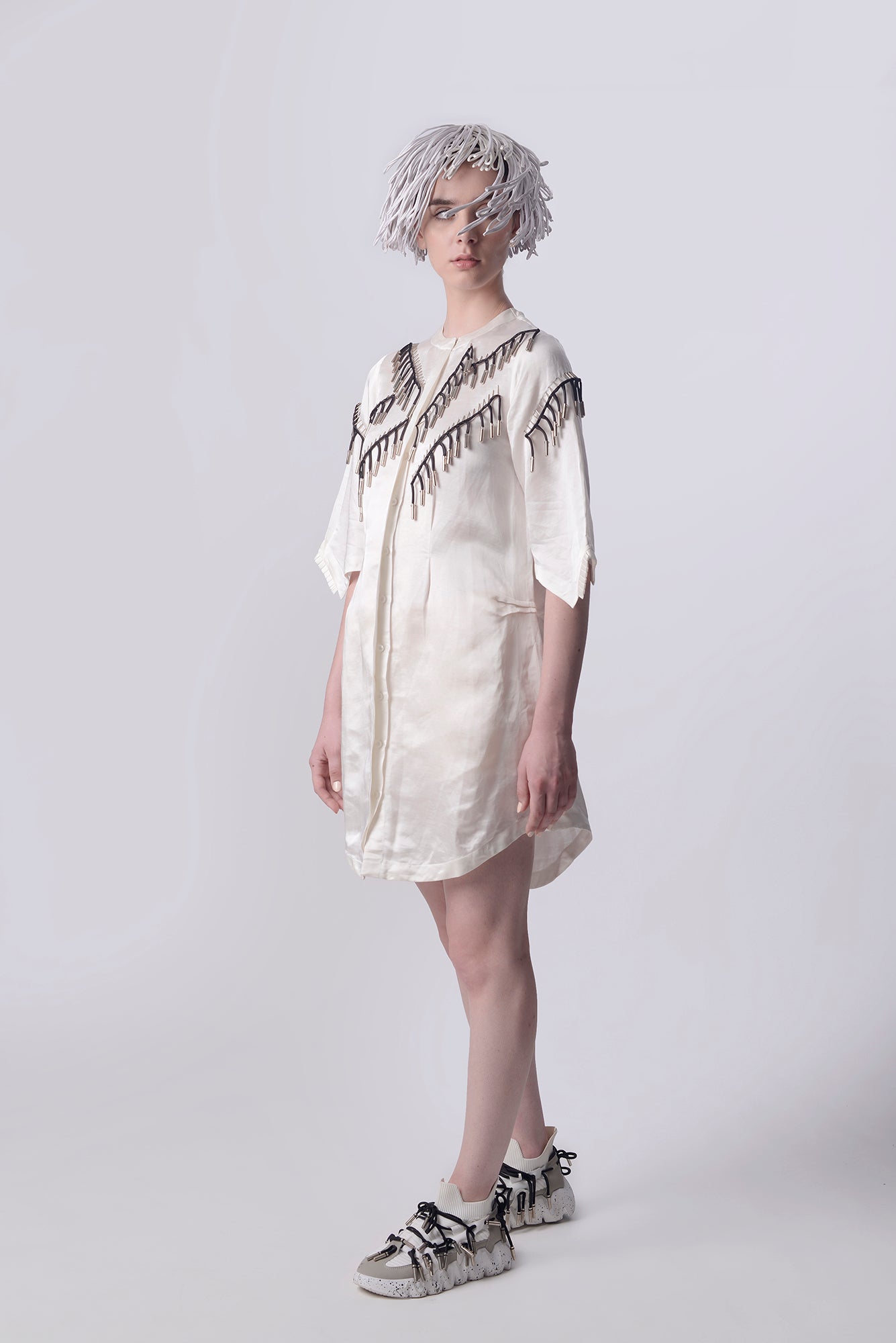 3D hand embroidered shirt dress in linen satin. The dress has a front button opening.